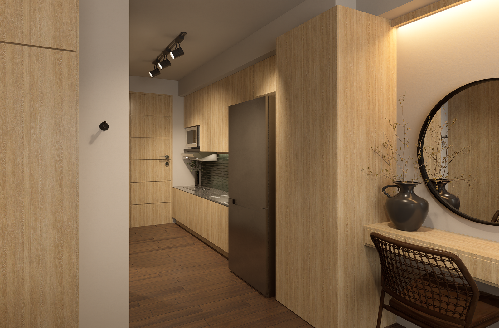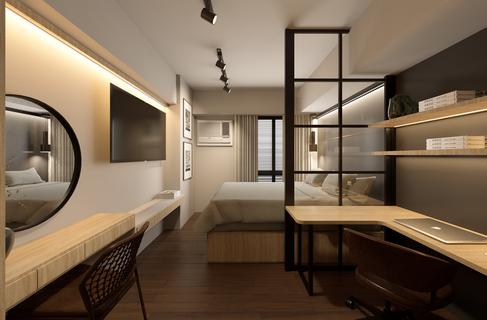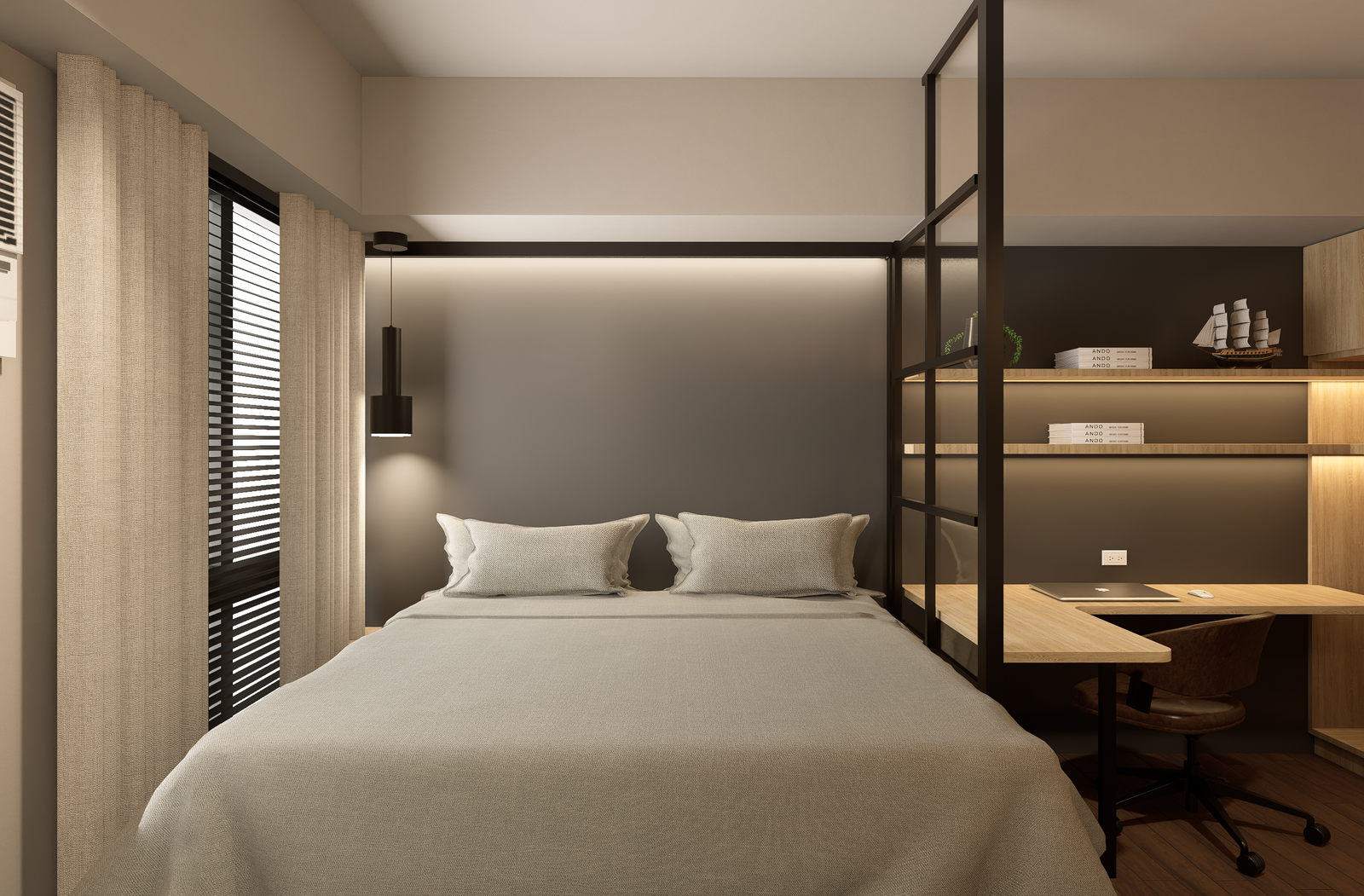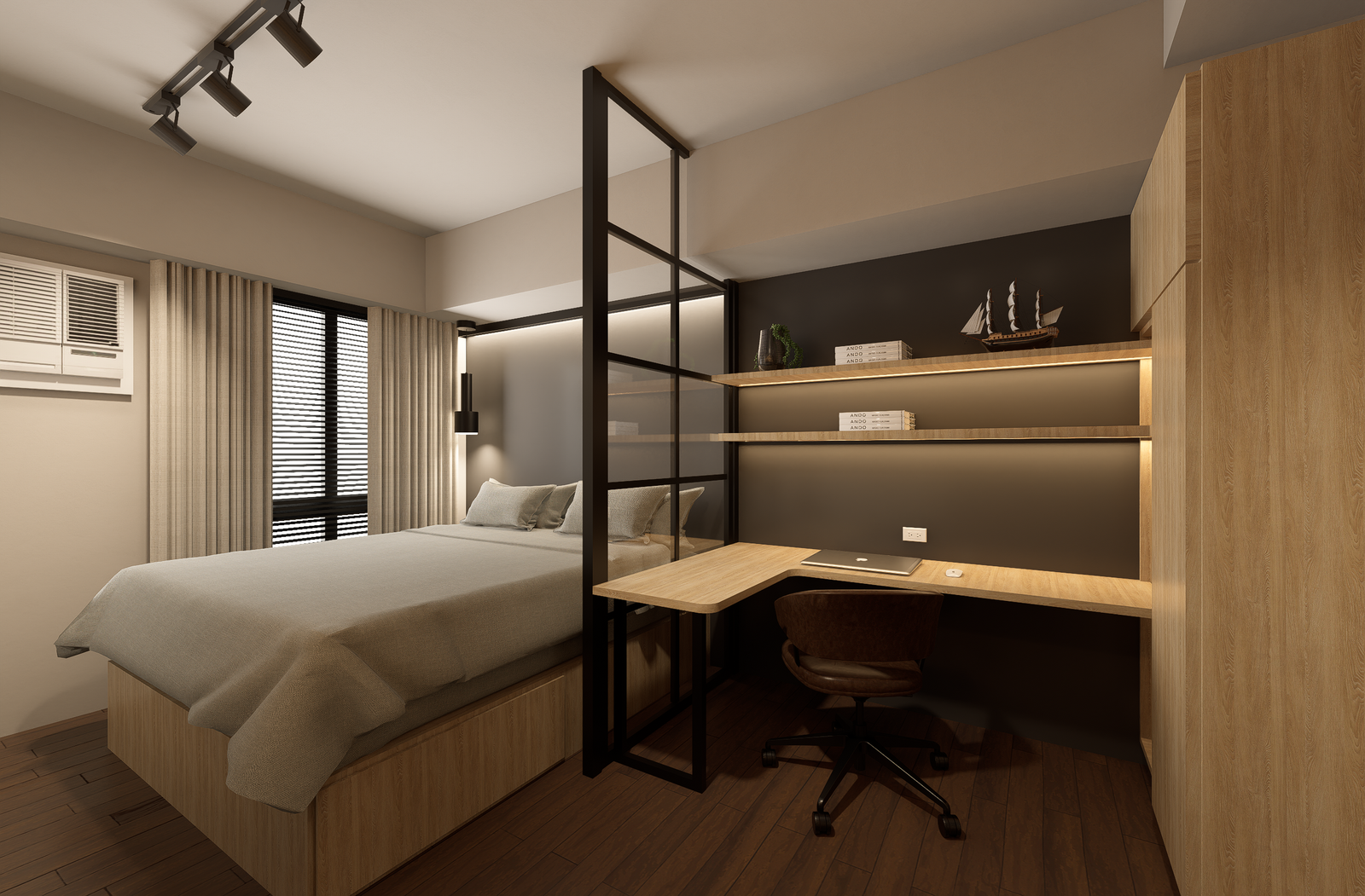The design narrative is grounded in a masculine yet understated palette of charcoal, deep walnut, and matte black, layered with warm metallic accents in brushed brass. Wide-plank oak flooring softens the architectural edge, while statement lighting—sculptural pendants and minimalist track systems—creates dramatic contrast against the industrial shell.