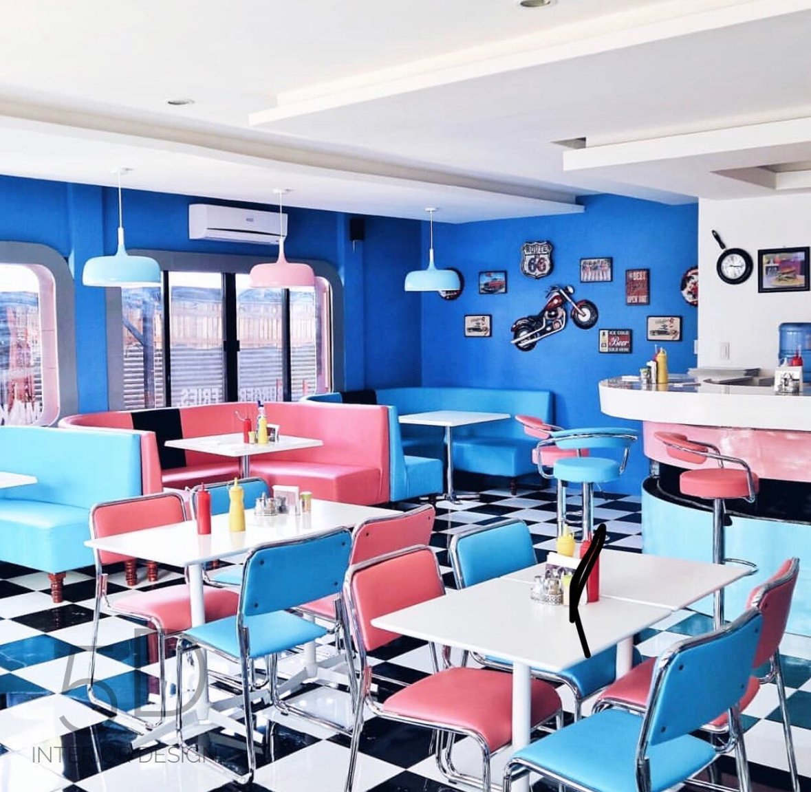 An American 90’s diner café interior captures a nostalgic blend of retro charm and casual comfort, brought to life through soft blue and pink accent tones. The space feels both playful and inviting, echoing the optimism and pop-culture vibrancy of the decade. Pastel hues wash over key design elements—powder blue & pink vinyl booths line the walls while muted color trims frame windows, countertops, and neon signage, creating a balanced yet eye-catching contrast.