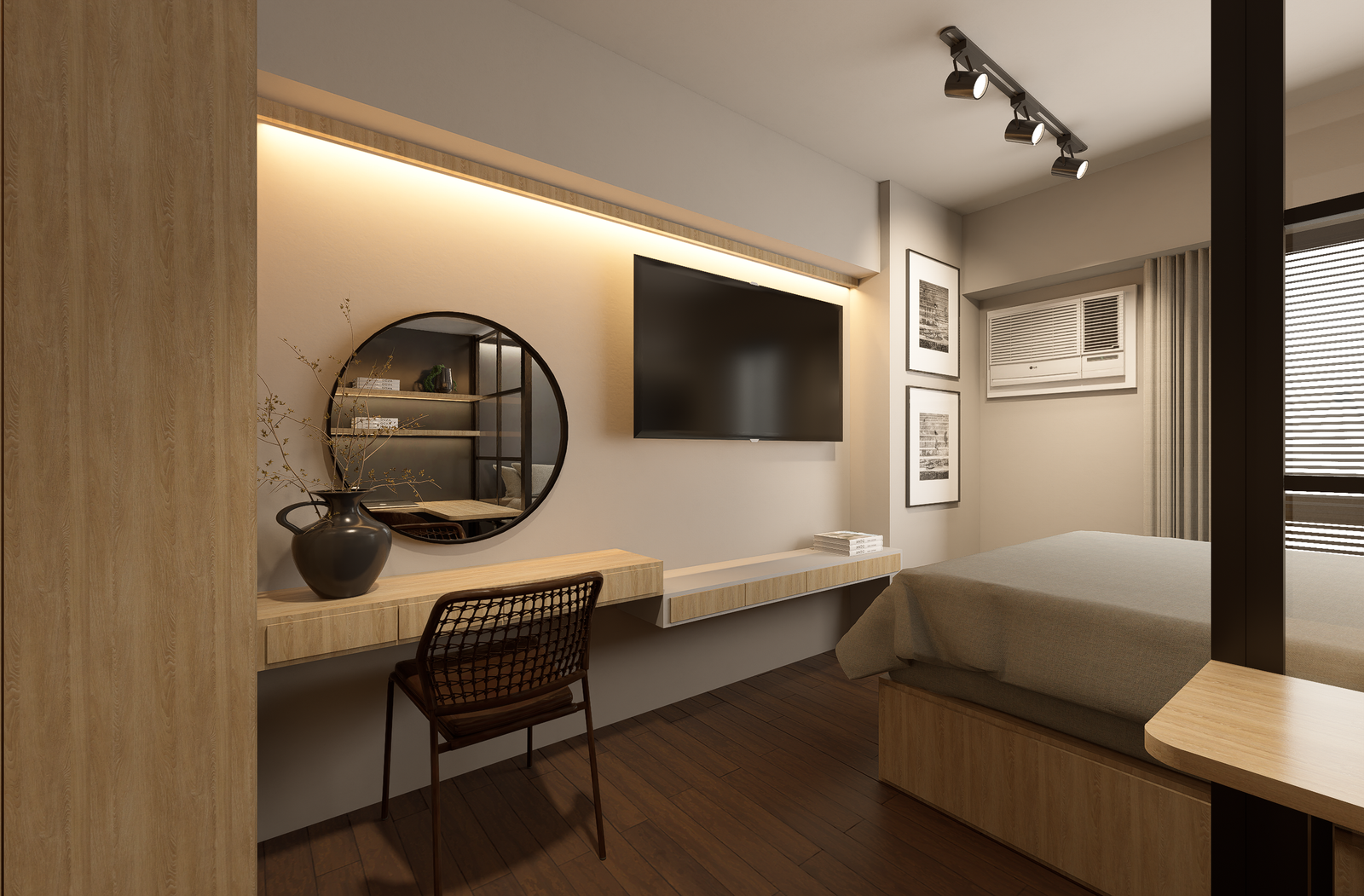 The design narrative is grounded in a masculine yet understated palette of charcoal, deep walnut, and matte black, layered with warm metallic accents in brushed brass. Wide-plank oak flooring softens the architectural edge, while statement lighting—sculptural pendants and minimalist track systems—creates dramatic contrast against the industrial shell.