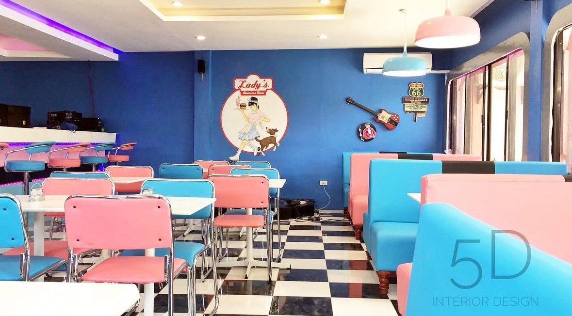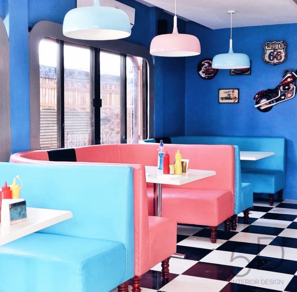 An American 90’s diner café interior captures a nostalgic blend of retro charm and casual comfort, brought to life through soft blue and pink accent tones. The space feels both playful and inviting, echoing the optimism and pop-culture vibrancy of the decade. Pastel hues wash over key design elements—powder blue & pink vinyl booths line the walls while muted color trims frame windows, countertops, and neon signage, creating a balanced yet eye-catching contrast.